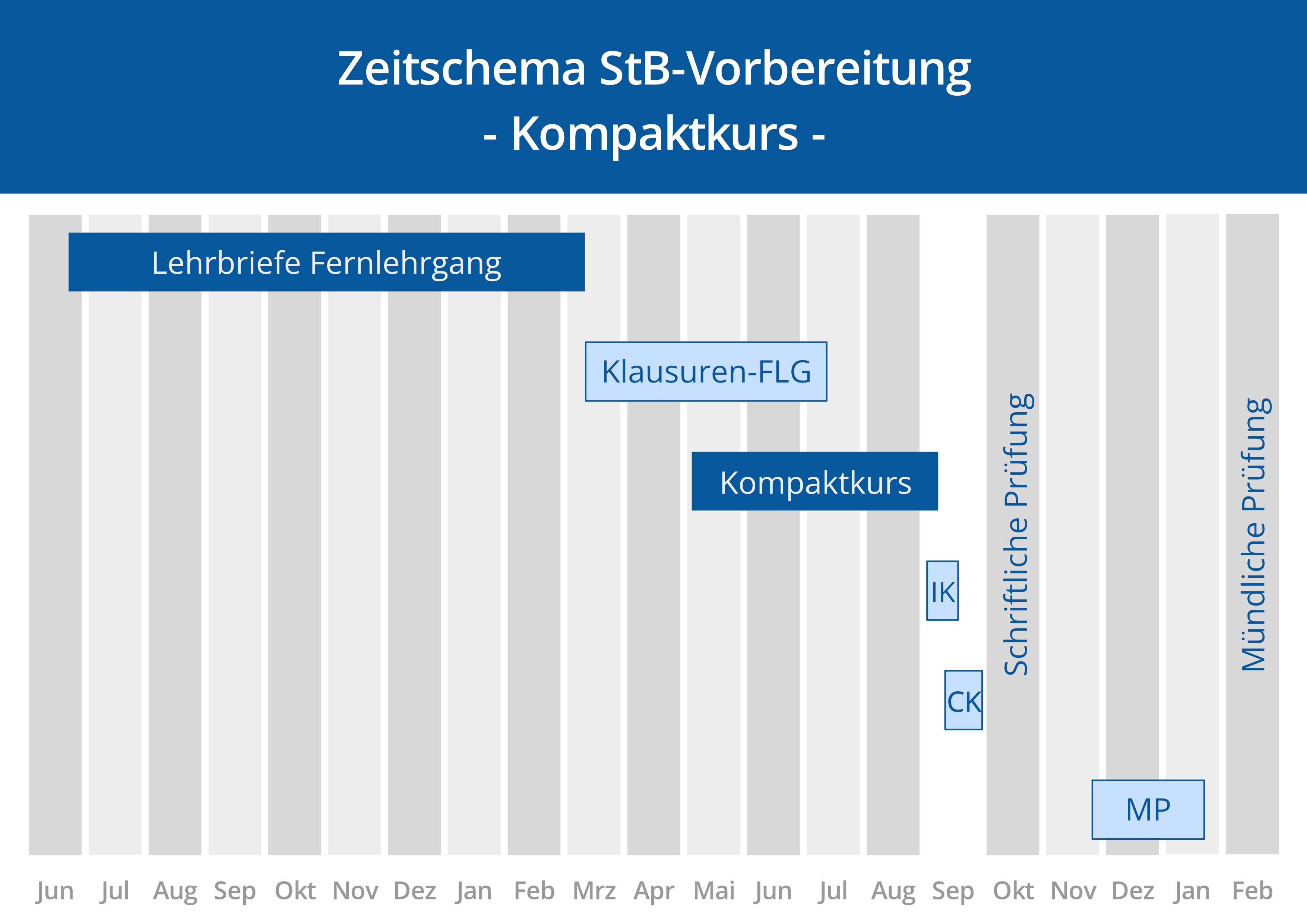 Sie haben ab Juli des Vorjahres bis Juni des Prüfungsjahres jede Woche 10 – 15 Stunden zur Vorbereitung auf die StB-Prüfung in Ihren Zeitplan integriert und nutzen diese Zeit zum intensiven Durcharbeiten unseres Fernlehrganges sowie des integrierten Klausurenfernlehrgangs. Als Abschluss der Vorbereitung empfehlen wir den Intensivkurs (drei Onlineklausuren aus dem Verfahrensrecht) sowie den Crashklausurenkurs (15 Klausuren), um den „Ernstfall“ unmittelbar vor der eigentlichen Prüfung zu trainieren.