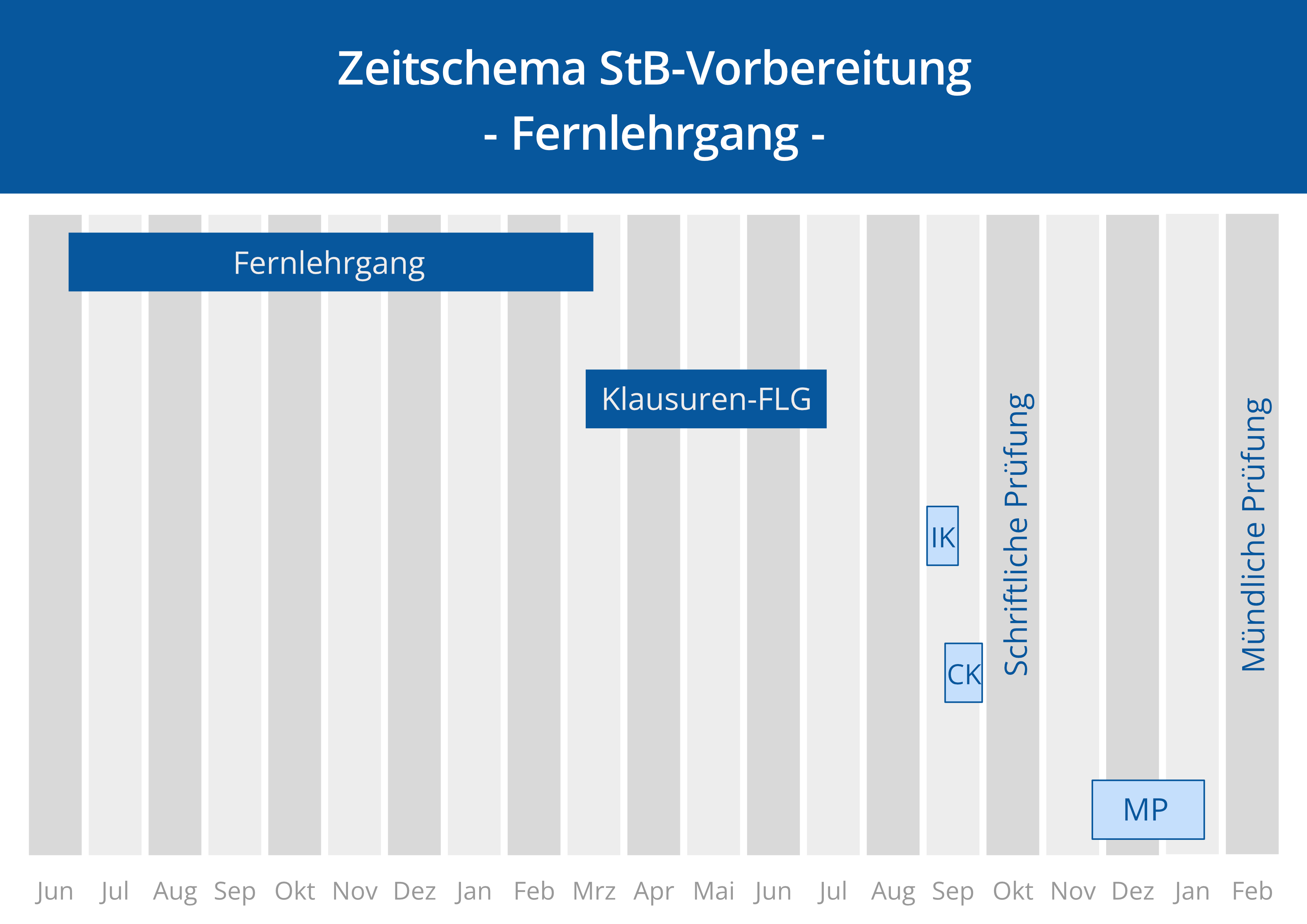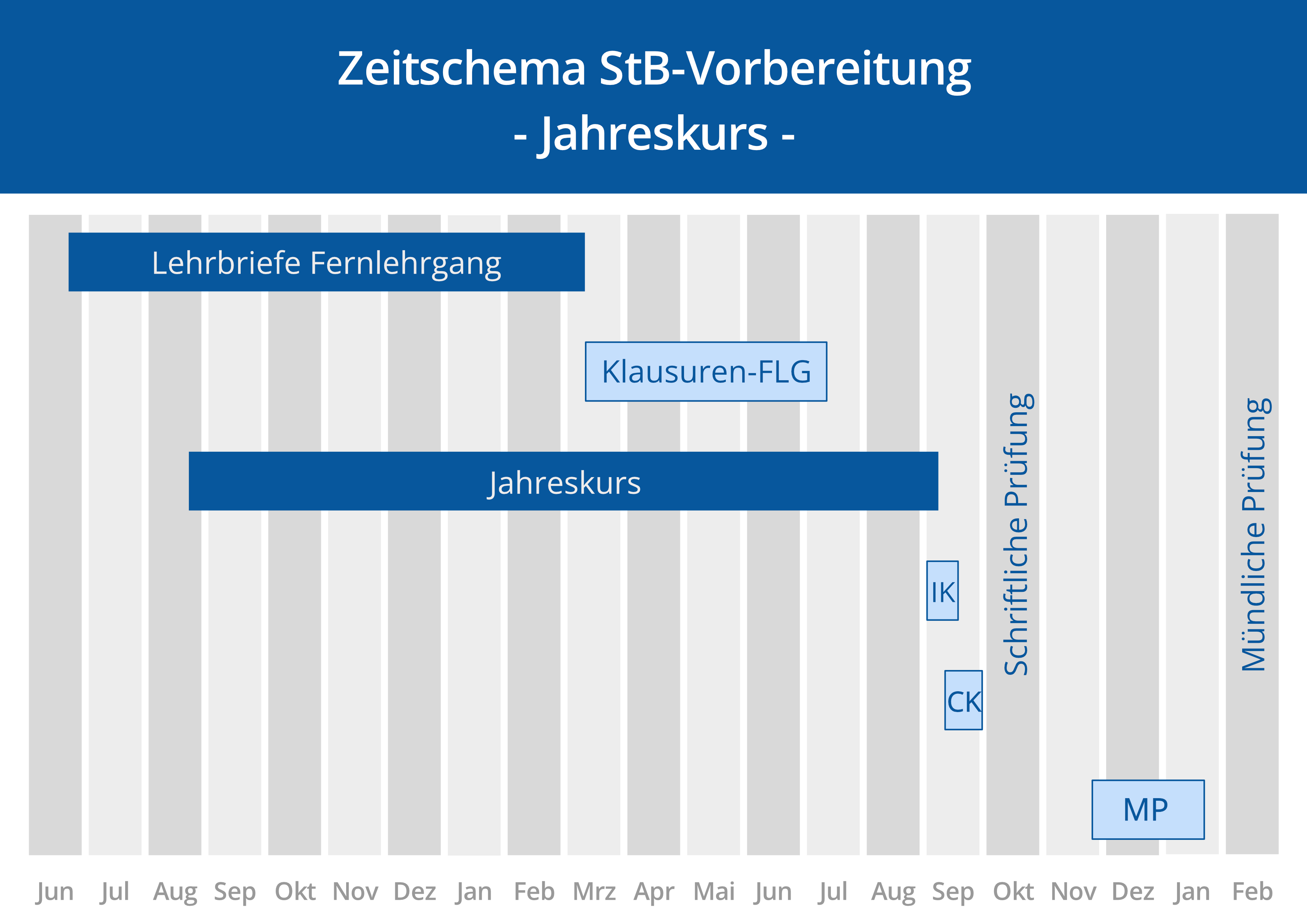 Sie haben ab Juli des Vorjahres bis Juni des Prüfungsjahres jede Woche 10 – 15 Stunden zur Vorbereitung auf die StB-Prüfung in Ihren Zeitplan integriert und nutzen diese Zeit zum intensiven Durcharbeiten unseres Fernlehrganges sowie des integrierten Klausurenfernlehrgangs. Als Abschluss der Vorbereitung empfehlen wir den Intensivkurs (drei Onlineklausuren aus dem Verfahrensrecht) sowie den Crashklausurenkurs (15 Klausuren), um den „Ernstfall“ unmittelbar vor der eigentlichen Prüfung zu trainieren.